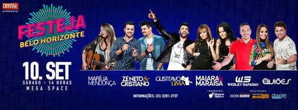 Os principais nomes da música brasileira atual estarão reunidos no Festeja Belo Horizonte. Neste sábado, dia 10 de setembro, a partir das 14h, o Mega Space (Av. das Indústrias, 3000, Santa Luzia,MG) receberá milhares de pessoas que irão curtir os shows de Wesley Safadão, Gusttavo Lima, Aviões do Forró, Zé Neto & Cristiano, Maiara & Maraísa, Marília Mendonça e ainda uma atração surpresa, que é considerado um dos maiores DJs do país. Além disso, os camarotes contarão com shows exclusivos da dupla Henrique & Matheus e do cantor Bernardo Souza, a partir das 1h da madrugada, logo após os shows no palco principal.